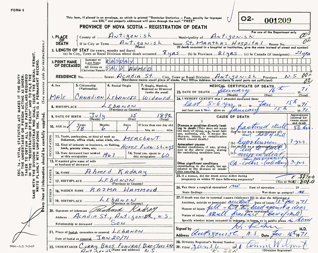 PROVINCE OF NOVA SCOTIA — REGISTRATION OF DEATH