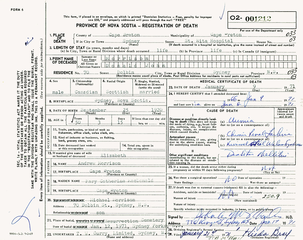 1. PLACE OF DEATH County of Cape Breton If in City or Town Sydney