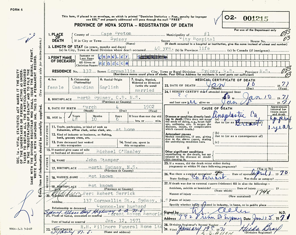 1. PLACE OF DEATH County of Cape Breton If in City or Town Sydney