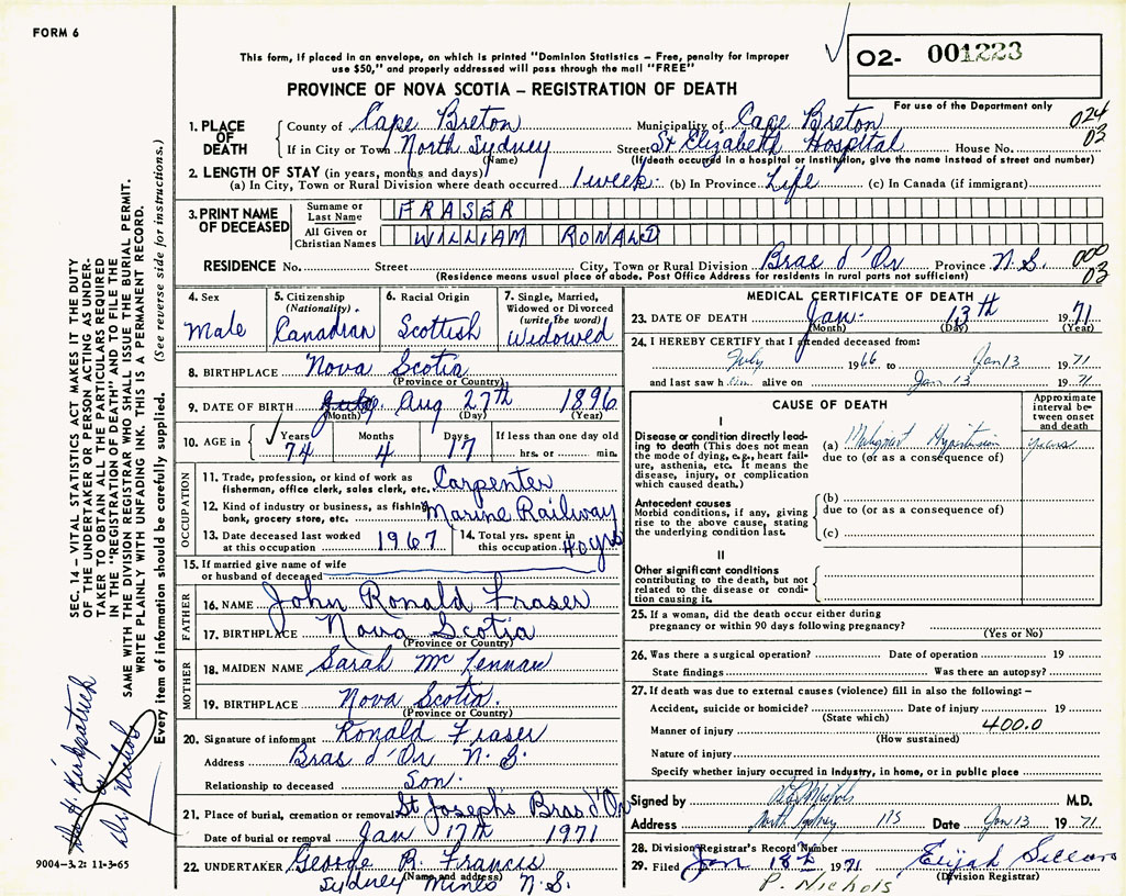 PROVINCE OF NOVA SCOTIA — REGISTRATION OF DEATH