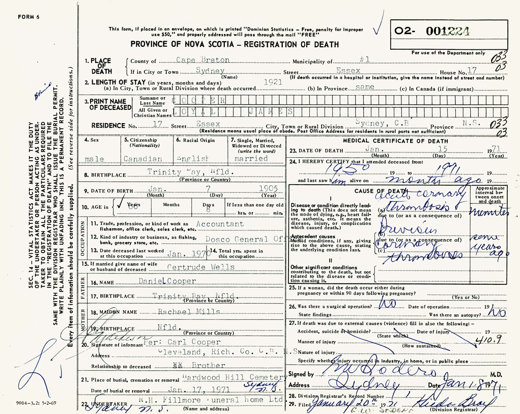 1. PLACE OF DEATH County of Cape Breton If in City or Town Sydney