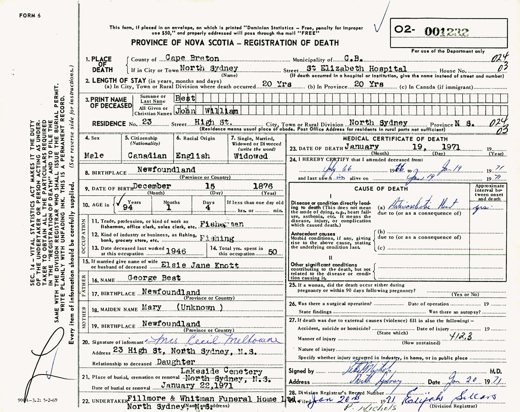 1. PLACE OF DEATH County of Cape Breton If in City or Town North Sydney
