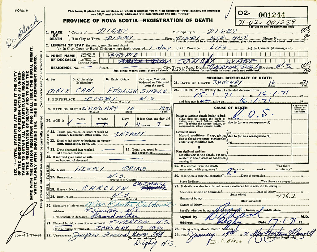 PROVINCE OF NOVA SCOTIA — REGISTRATION OF DEATH