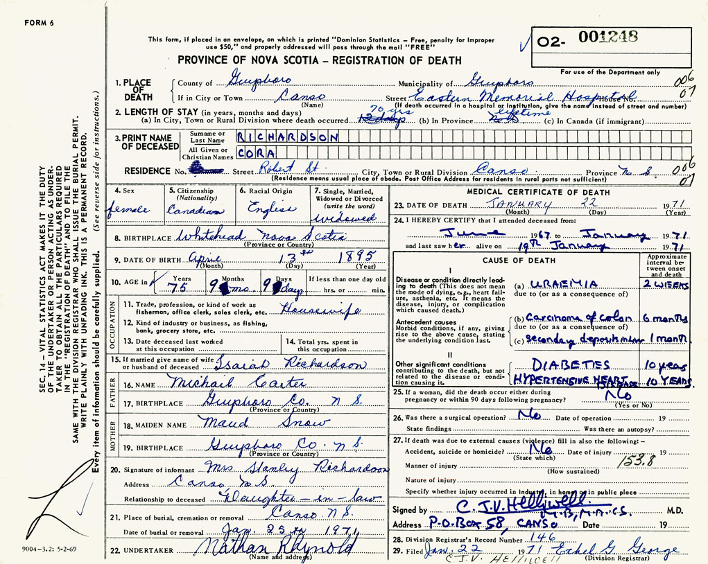 PROVINCE OF NOVA SCOTIA — REGISTRATION OF DEATH