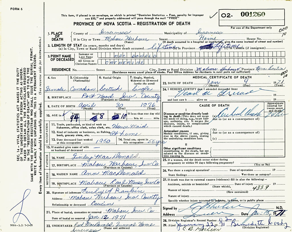 PROVINCE OF NOVA SCOTIA — REGISTRATION OF DEATH