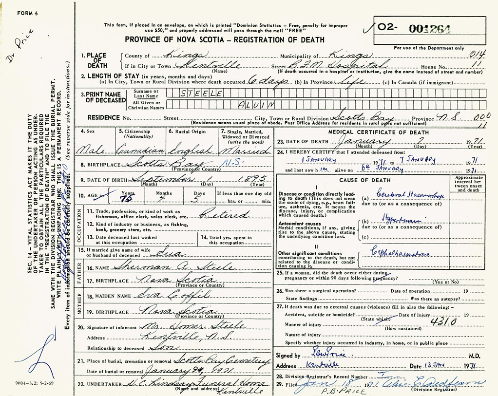 PROVINCE OF NOVA SCOTIA — REGISTRATION OF DEATH