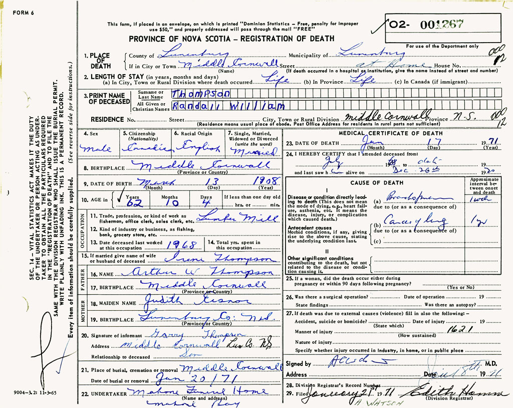 1. PLACE OF DEATH County of Lunenburg If in City or Town Middle Cornwall