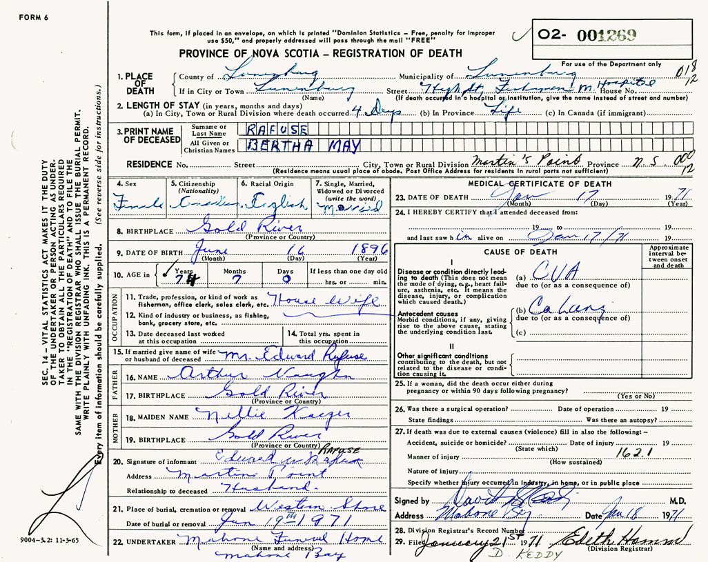 PROVINCE OF NOVA SCOTIA — REGISTRATION OF DEATH