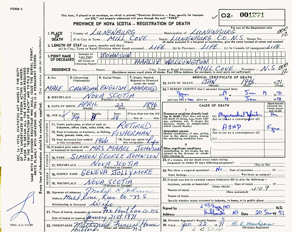 1. PLACE OF DEATH County of Lunenburg If in City or Town Mill Cove