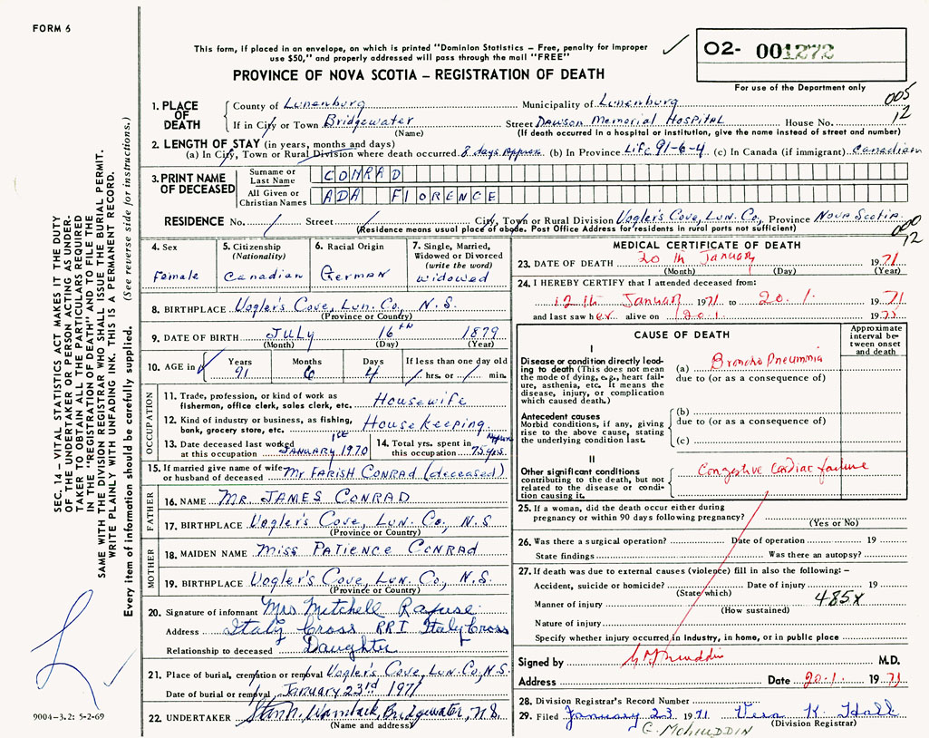 PROVINCE OF NOVA SCOTIA — REGISTRATION OF DEATH