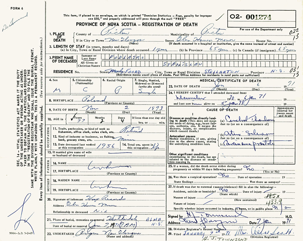 PROVINCE OF NOVA SCOTIA — REGISTRATION OF DEATH