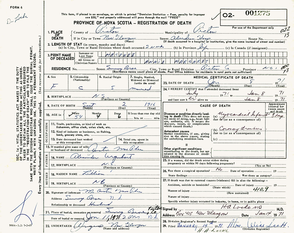 1. PLACE OF DEATH County of Pictou If in City or Town New Glasgow