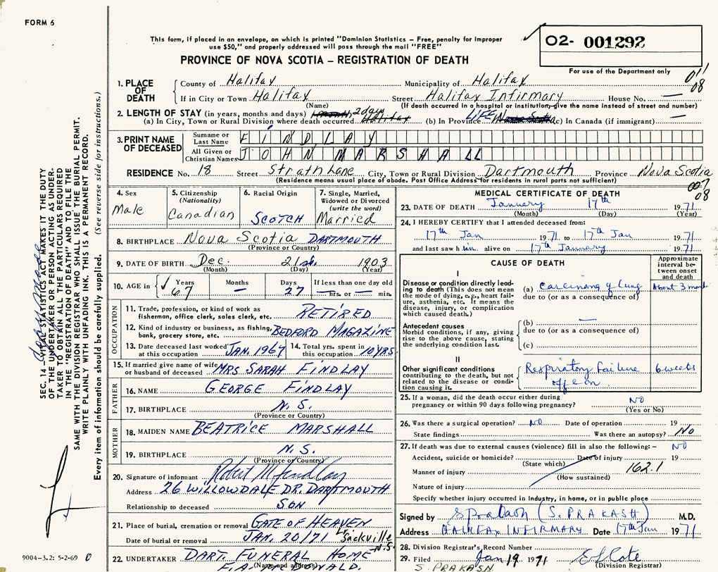 PROVINCE OF NOVA SCOTIA — REGISTRATION OF DEATH