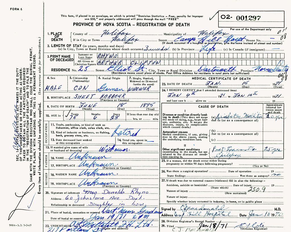PROVINCE OF NOVA SCOTIA — REGISTRATION OF DEATH