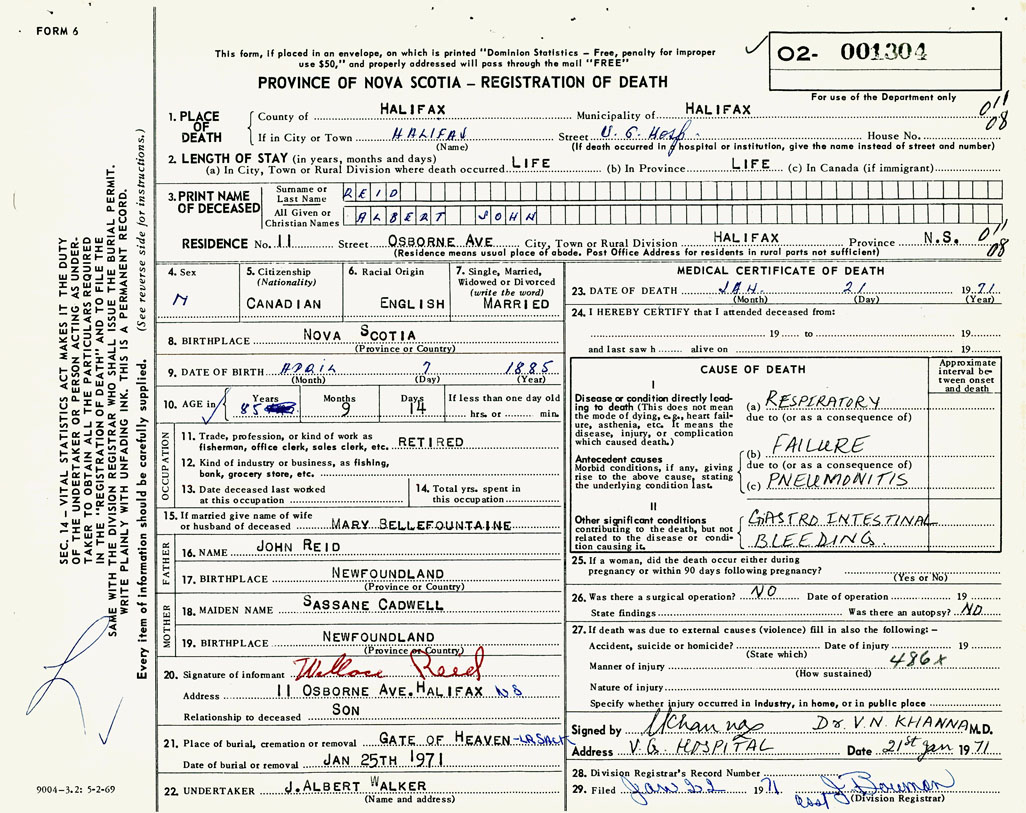 PROVINCE OF NOVA SCOTIA — REGISTRATION OF DEATH