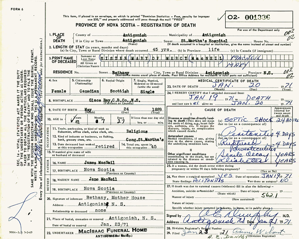 1. PLACE OF DEATH County of Antigonish If in City or Town Antigonish