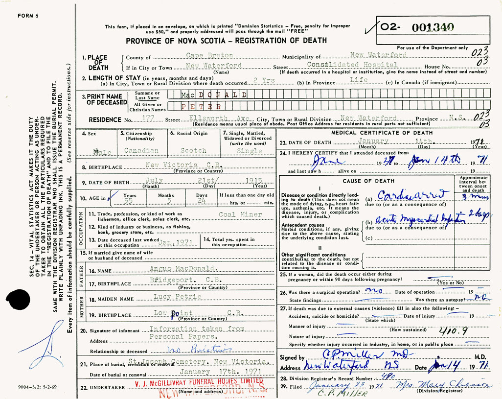 1. PLACE OF DEATH County of Cape Breton If in City or Town New Waterford