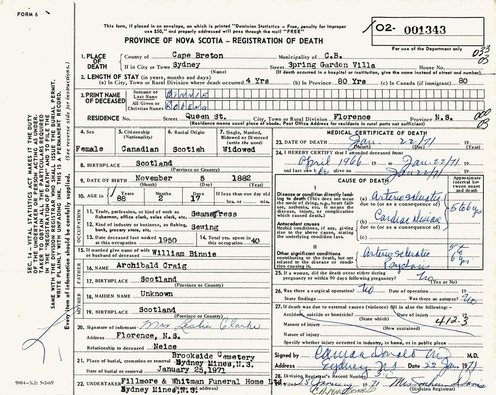 22. Undertaker Fillmore & Whitman Funeral Home Ltd., Sydney Mines