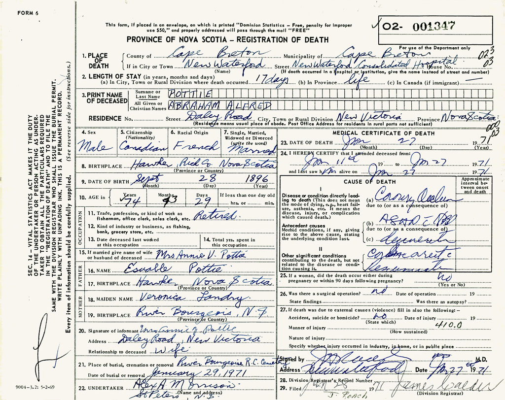 1. PLACE OF DEATH County of Cape Breton If in City or Town New Waterford