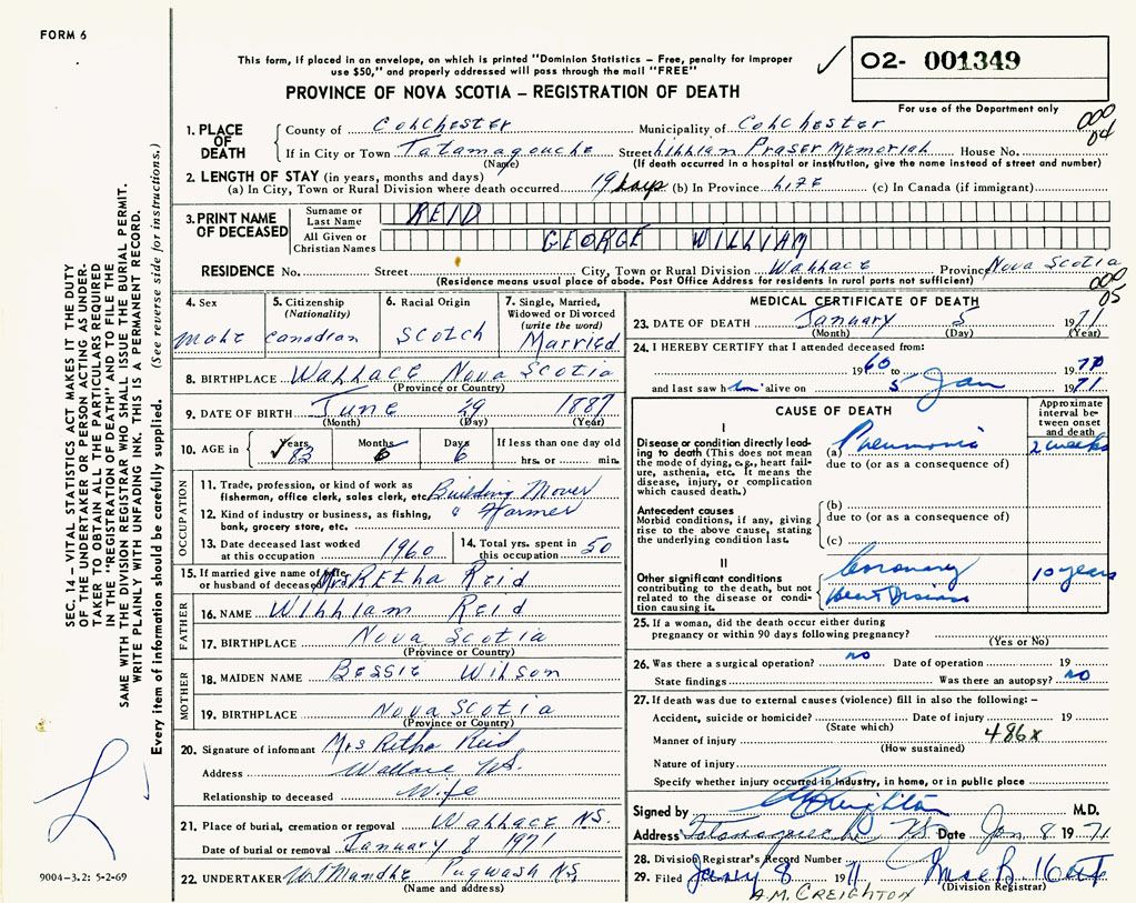 PROVINCE OF NOVA SCOTIA — REGISTRATION OF DEATH