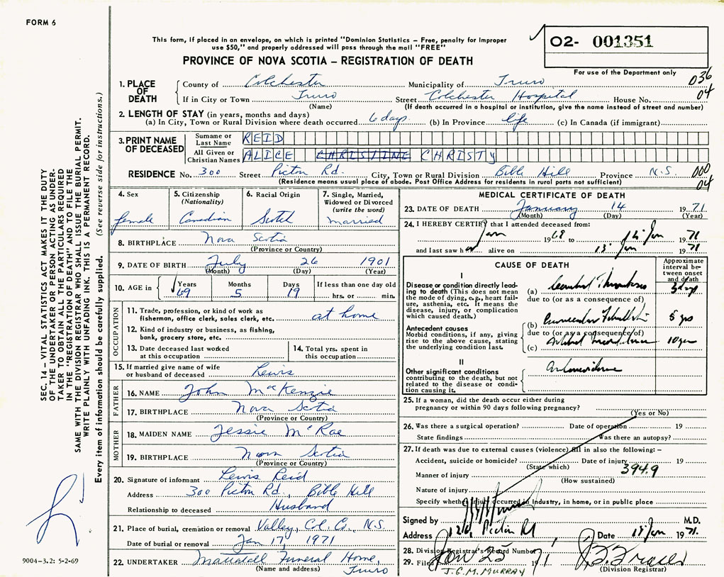 PROVINCE OF NOVA SCOTIA — REGISTRATION OF DEATH