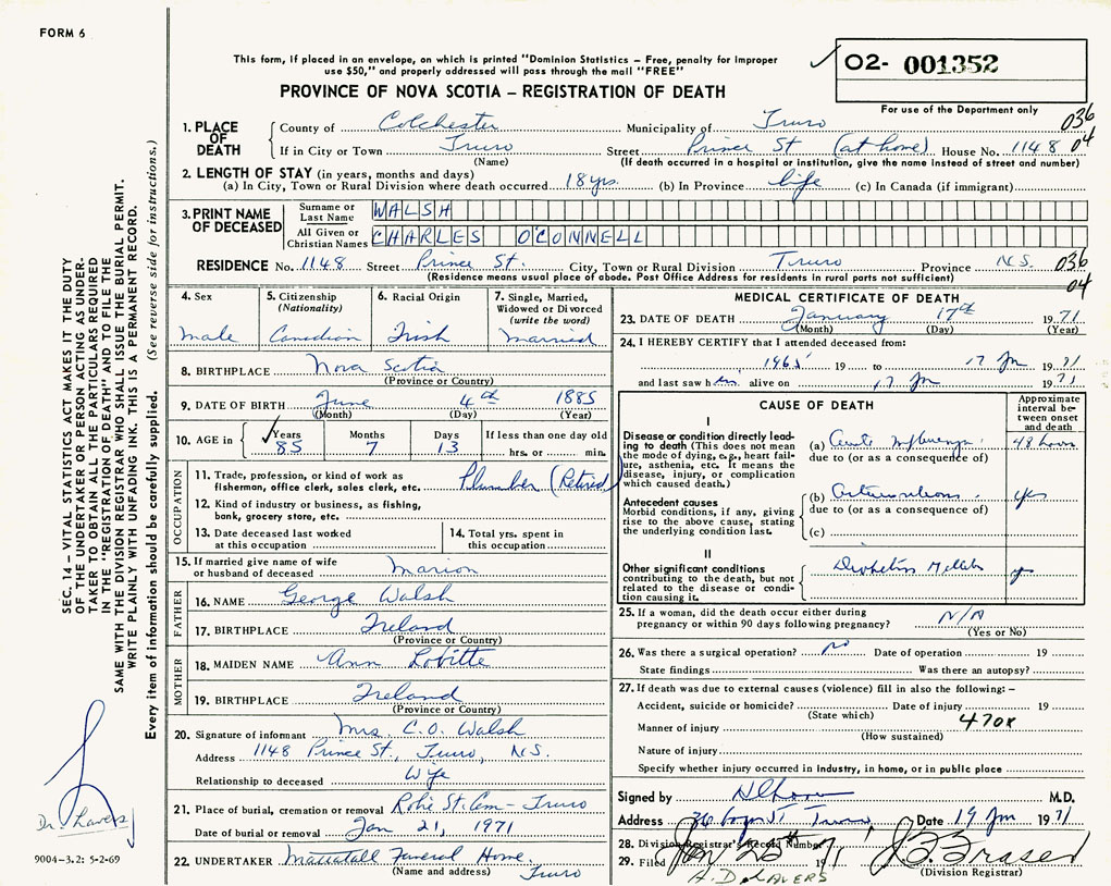 PROVINCE OF NOVA SCOTIA — REGISTRATION OF DEATH