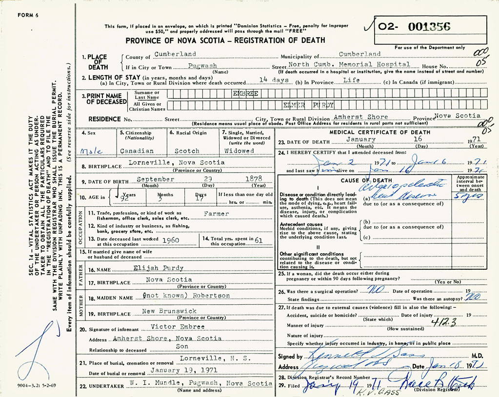 1. PLACE OF DEATH County of Cumberland If in City or Town Pugwash