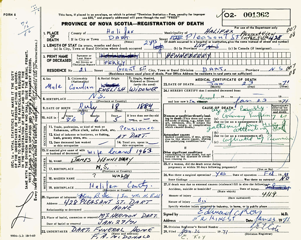PROVINCE OF NOVA SCOTIA — REGISTRATION OF DEATH