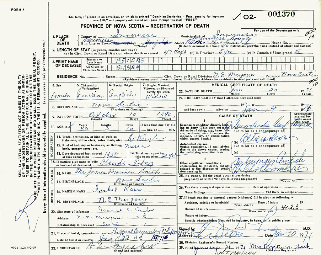 PROVINCE OF NOVA SCOTIA — REGISTRATION OF DEATH