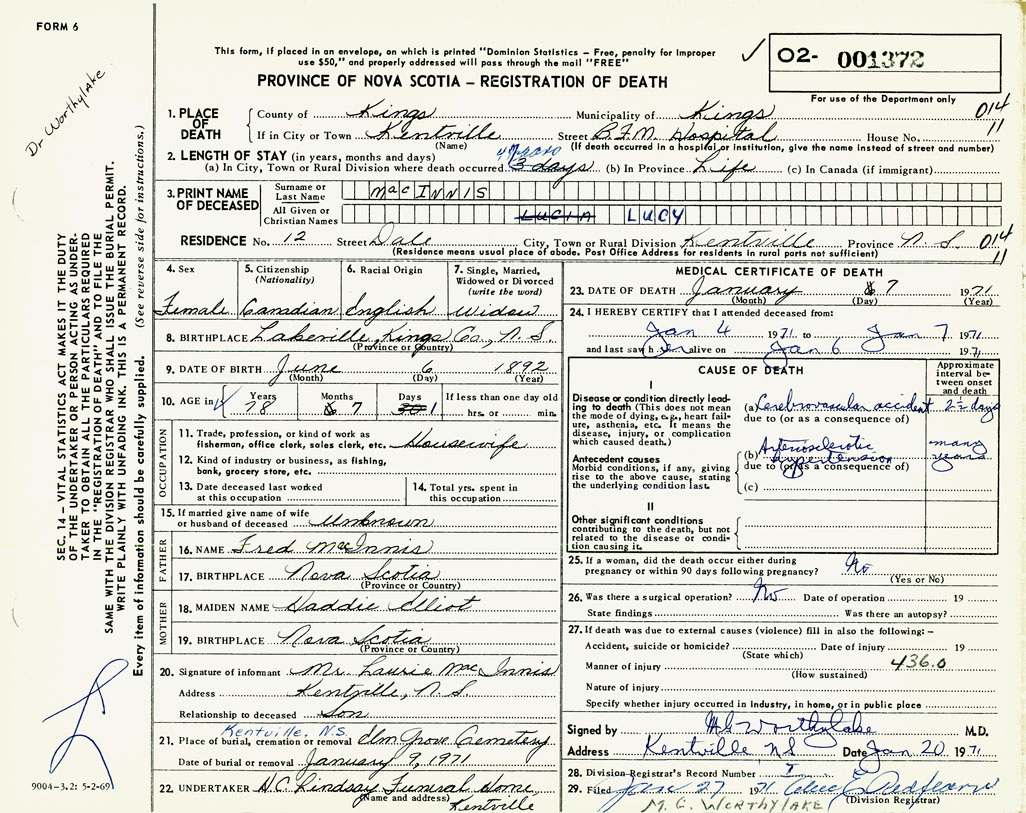 PROVINCE OF NOVA SCOTIA — REGISTRATION OF DEATH