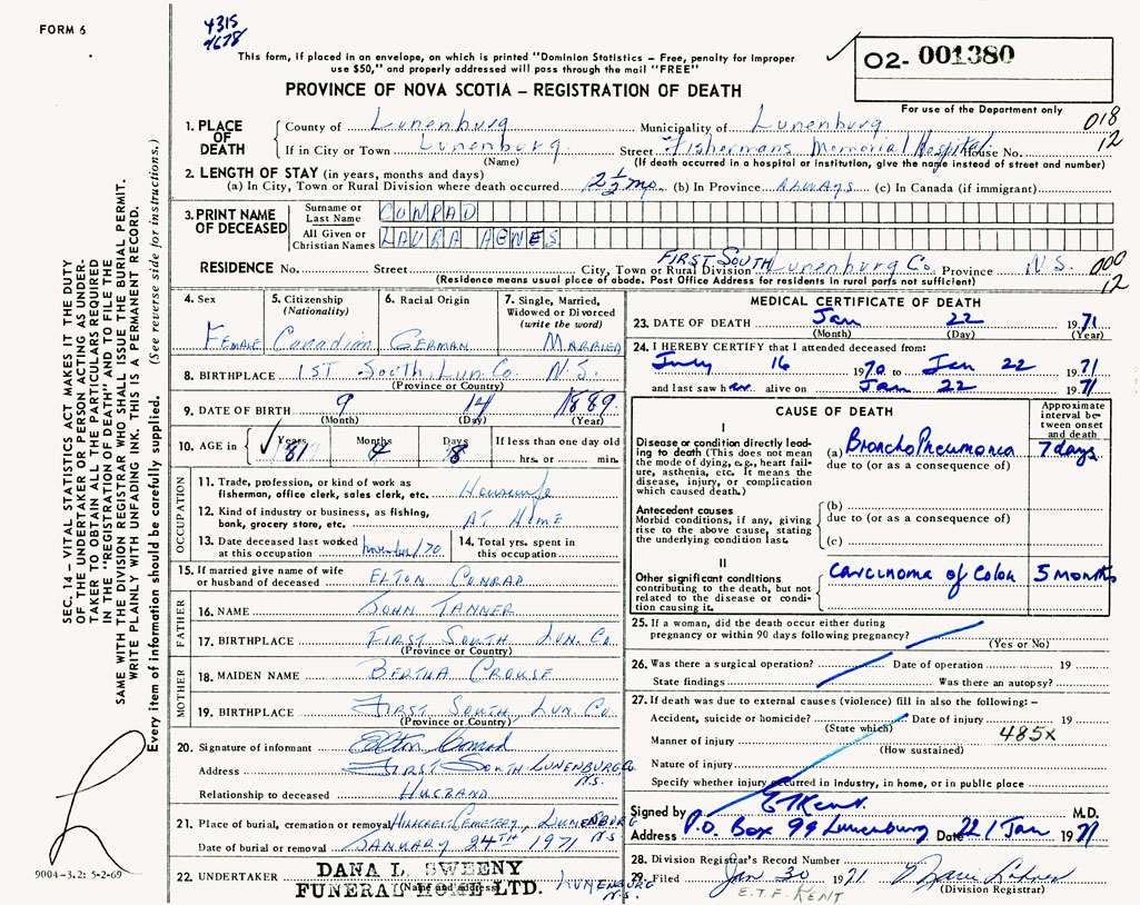 22. Undertaker Dana L. Sweeny Funeral Home Ltd., Lunenburg