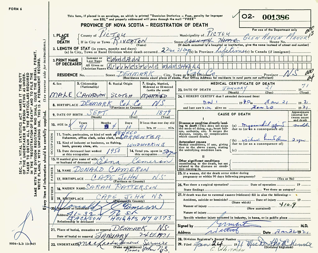 PROVINCE OF NOVA SCOTIA — REGISTRATION OF DEATH