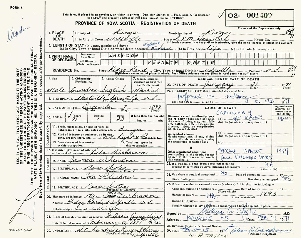 PROVINCE OF NOVA SCOTIA — REGISTRATION OF DEATH