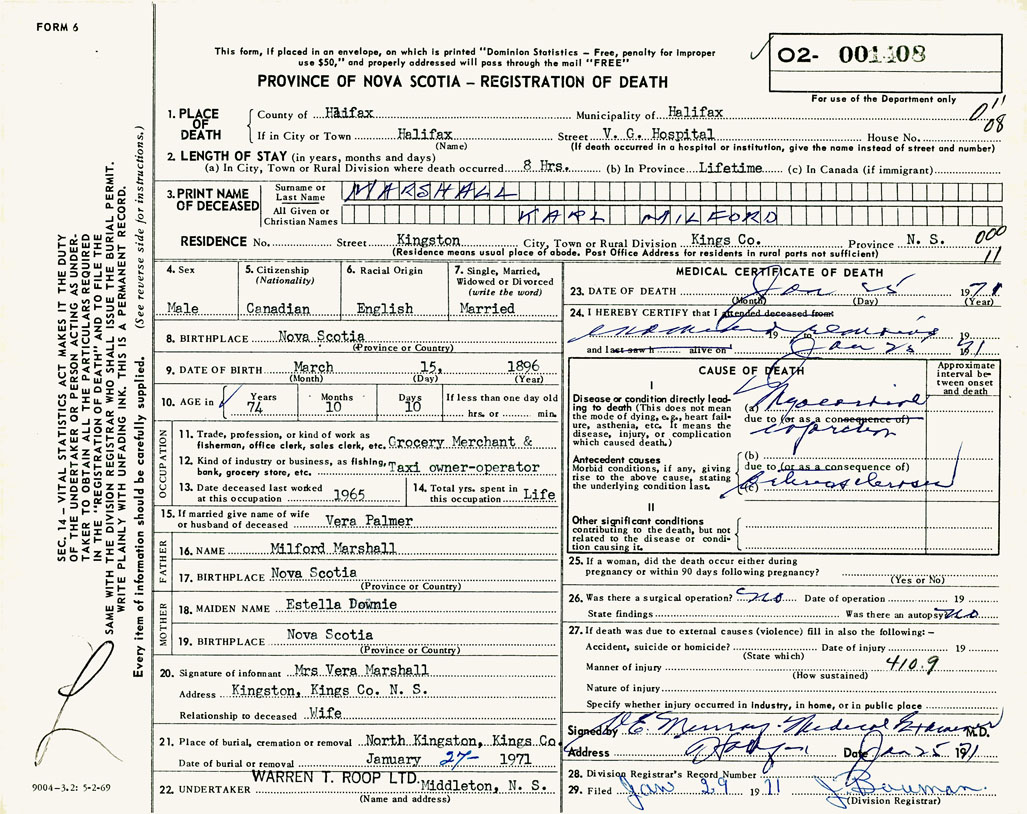 PROVINCE OF NOVA SCOTIA — REGISTRATION OF DEATH