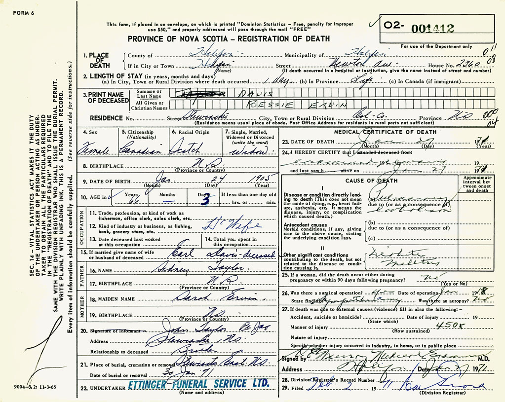 PROVINCE OF NOVA SCOTIA — REGISTRATION OF DEATH