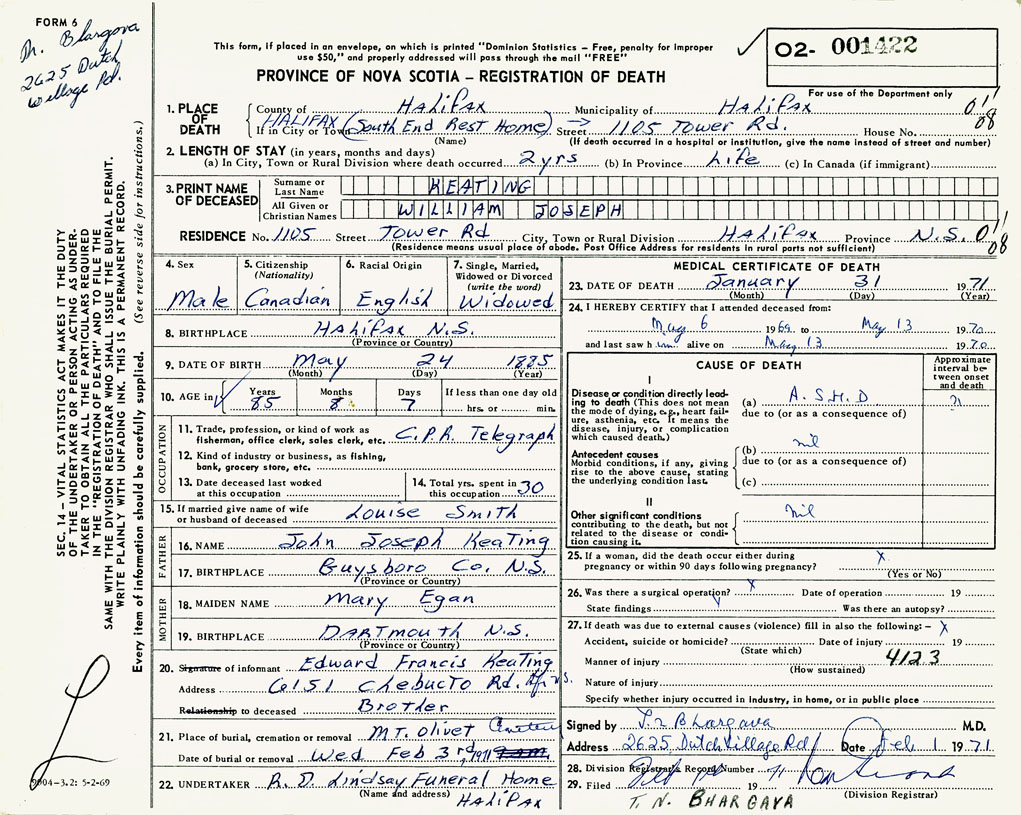 PROVINCE OF NOVA SCOTIA — REGISTRATION OF DEATH