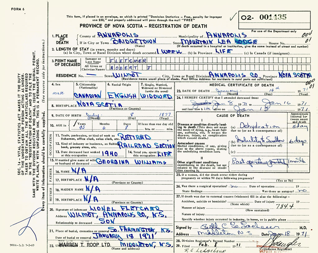 PROVINCE OF NOVA SCOTIA — REGISTRATION OF DEATH