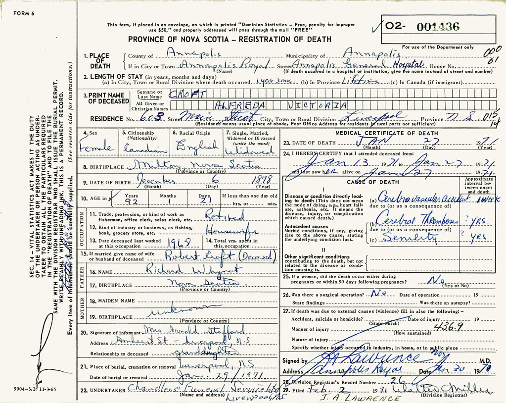 PROVINCE OF NOVA SCOTIA — REGISTRATION OF DEATH