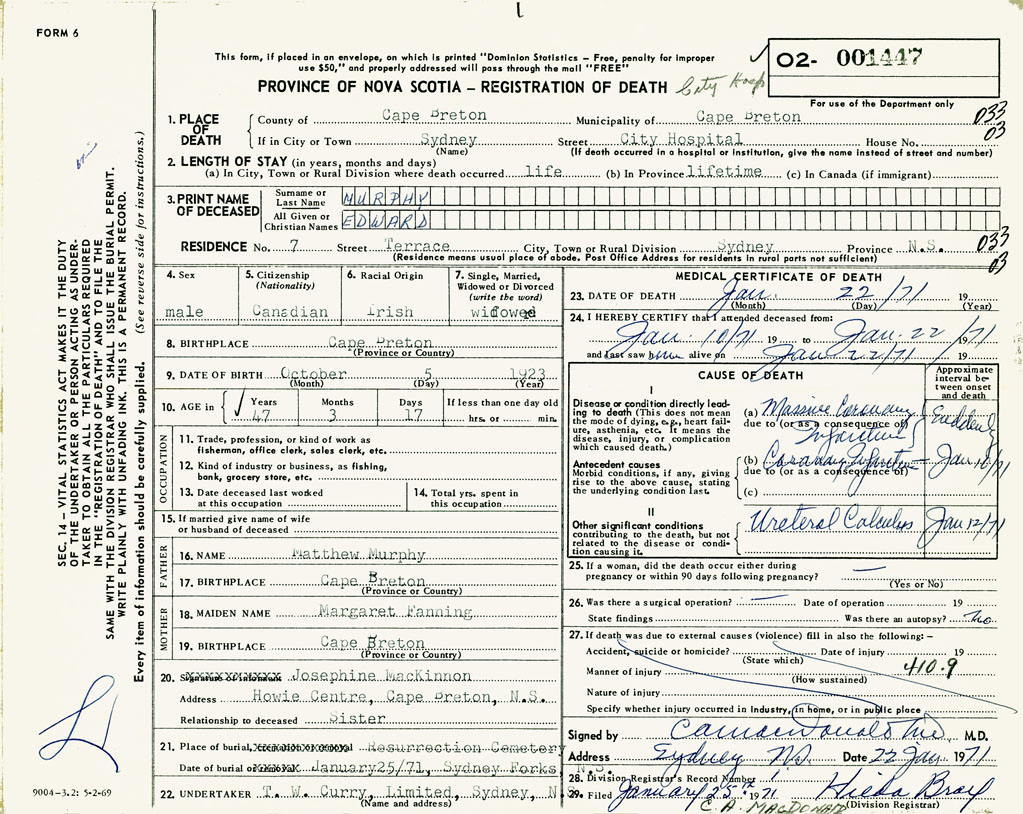 1. PLACE OF DEATH County of Cape Breton If in City or Town Sydney