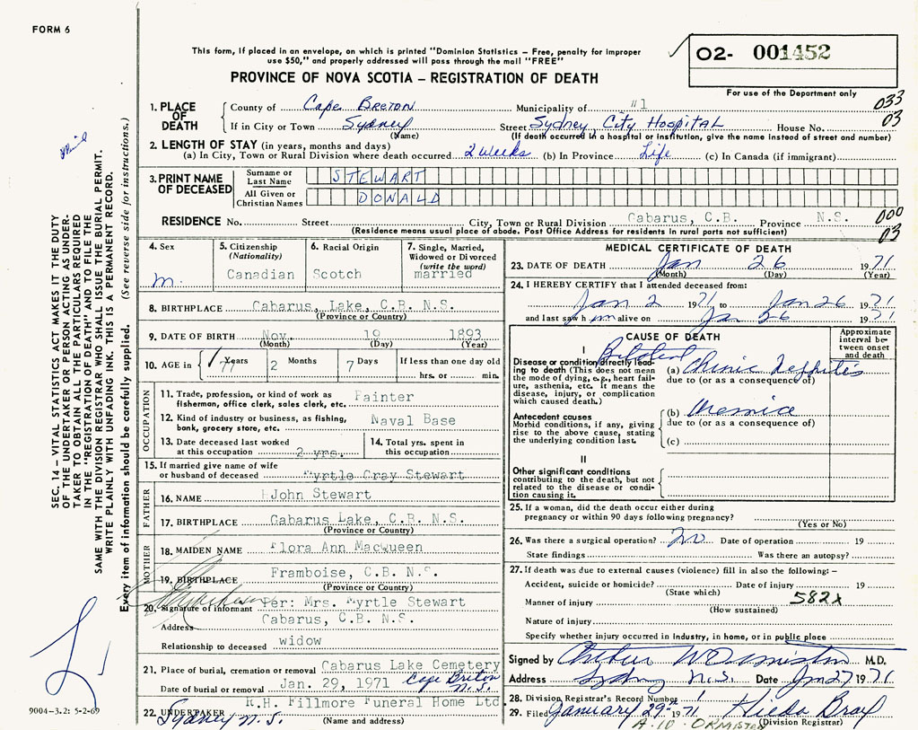 PROVINCE OF NOVA SCOTIA — REGISTRATION OF DEATH