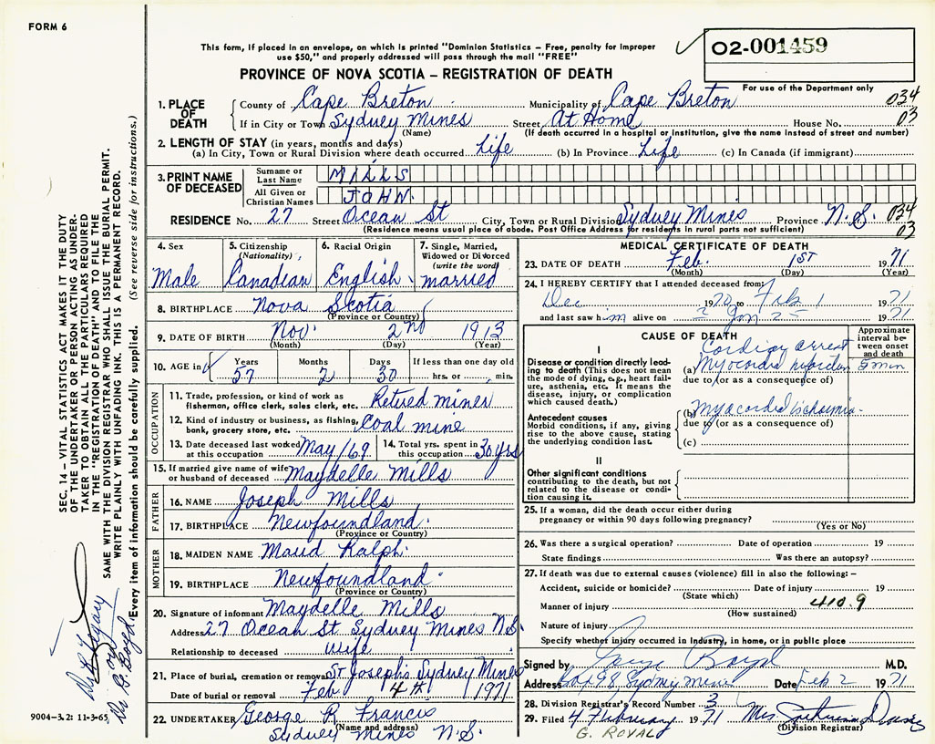 1. PLACE OF DEATH County of Cape Breton If in City or Town Sydney Mines