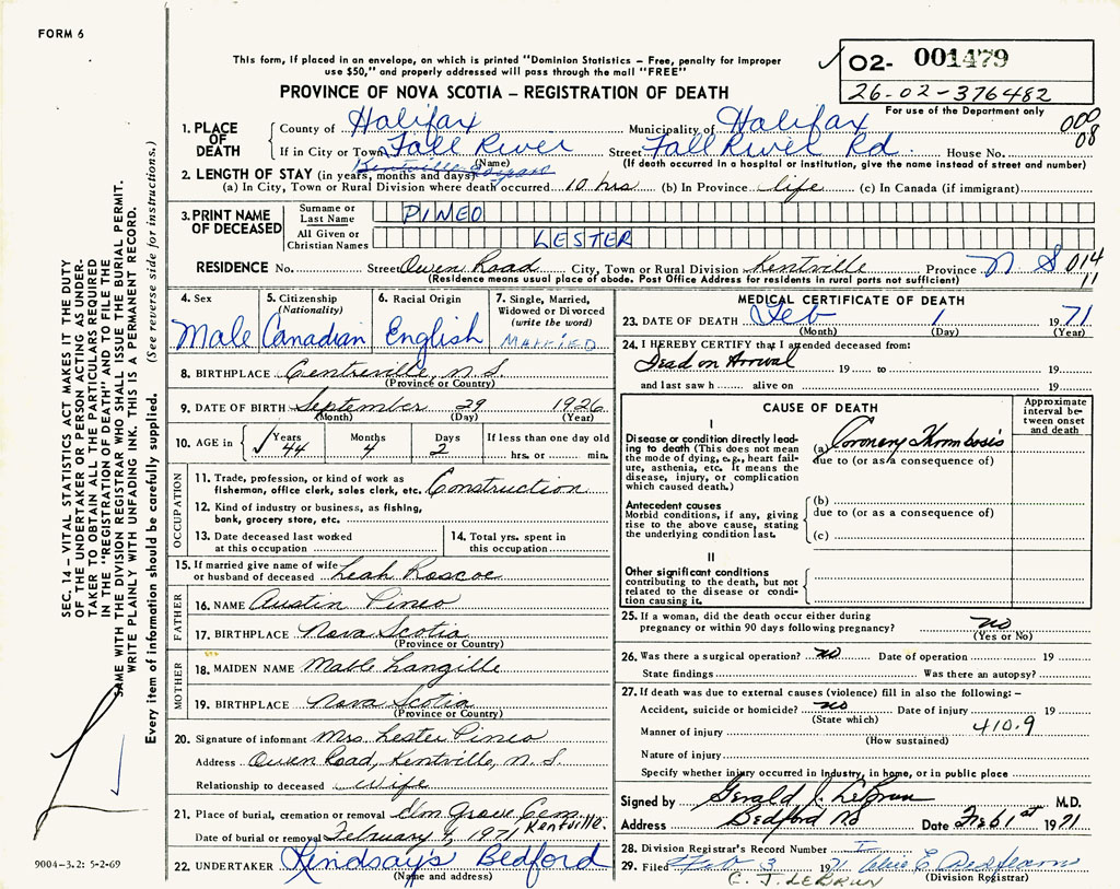 PROVINCE OF NOVA SCOTIA — REGISTRATION OF DEATH