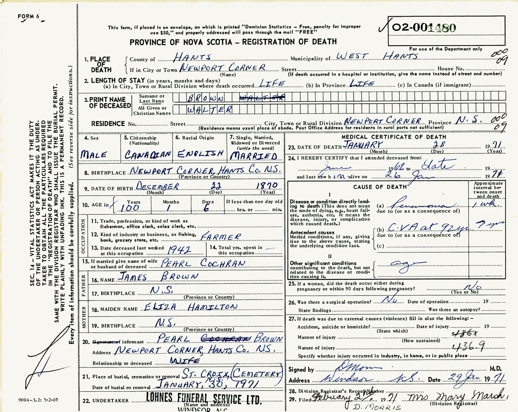 PROVINCE OF NOVA SCOTIA — REGISTRATION OF DEATH