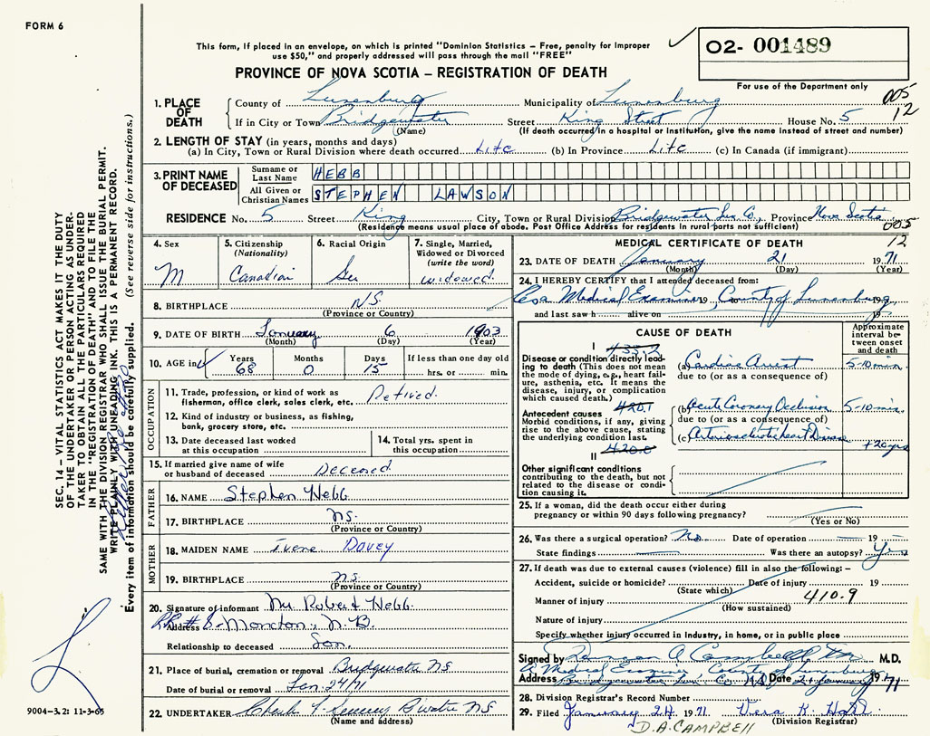 PROVINCE OF NOVA SCOTIA — REGISTRATION OF DEATH