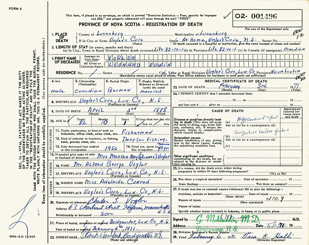 1. PLACE OF DEATH County of Lunenburg If in City or Town Voglers Cove