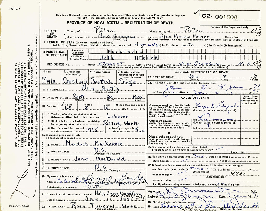 1. PLACE OF DEATH County of Pictou If in City or Town New Glasgow
