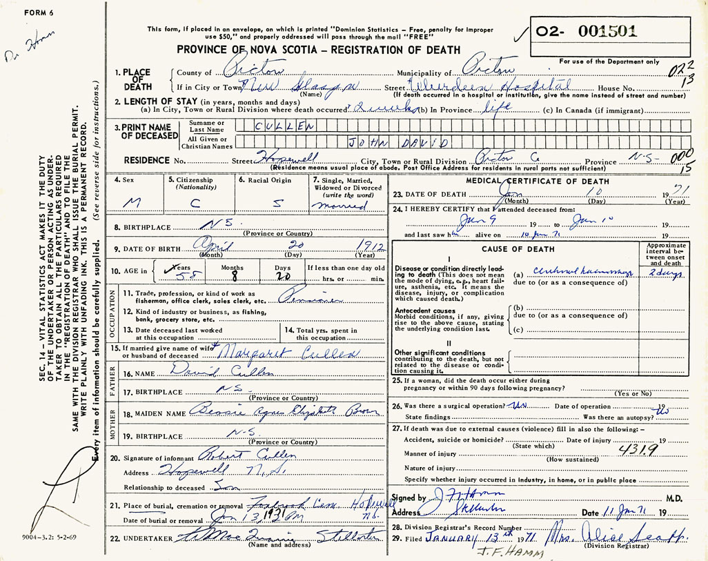 PROVINCE OF NOVA SCOTIA — REGISTRATION OF DEATH