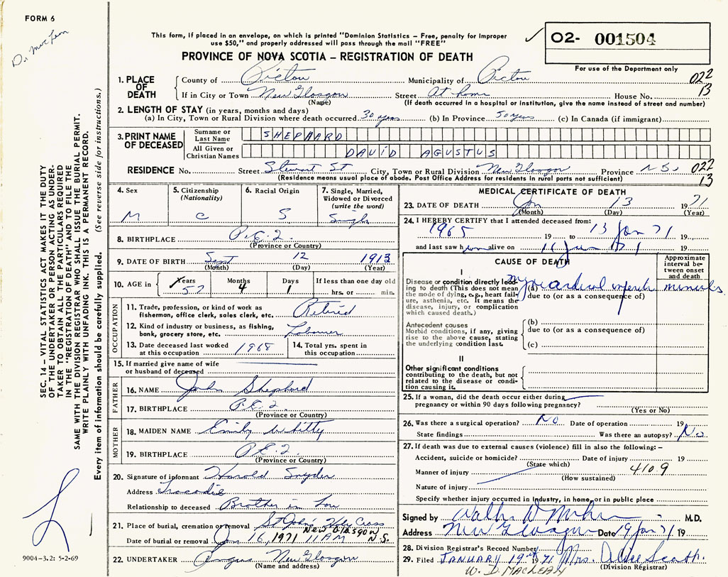 PROVINCE OF NOVA SCOTIA — REGISTRATION OF DEATH