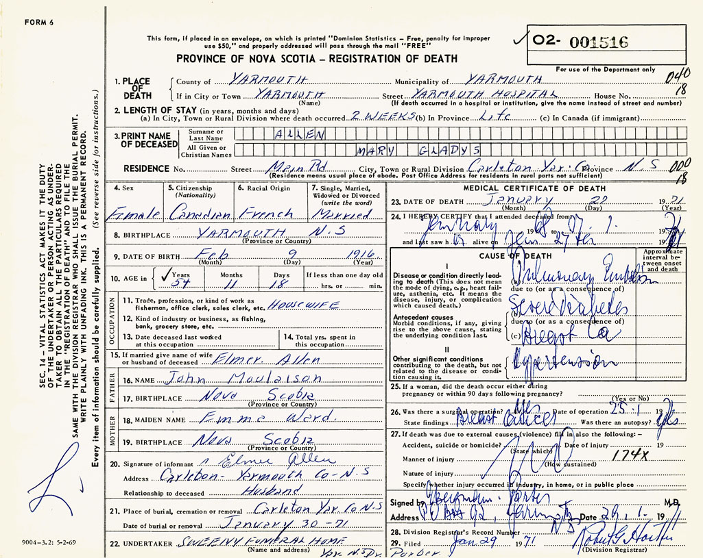PROVINCE OF NOVA SCOTIA — REGISTRATION OF DEATH