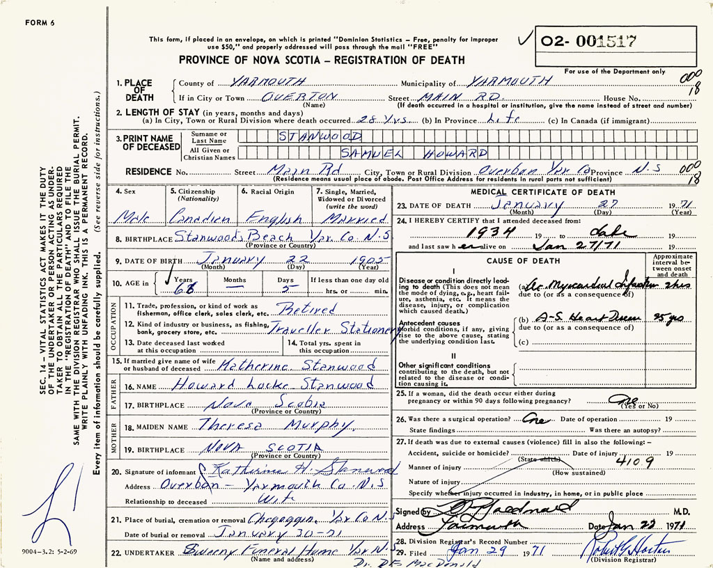 PROVINCE OF NOVA SCOTIA — REGISTRATION OF DEATH